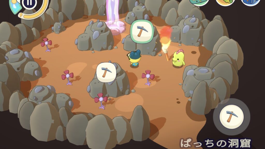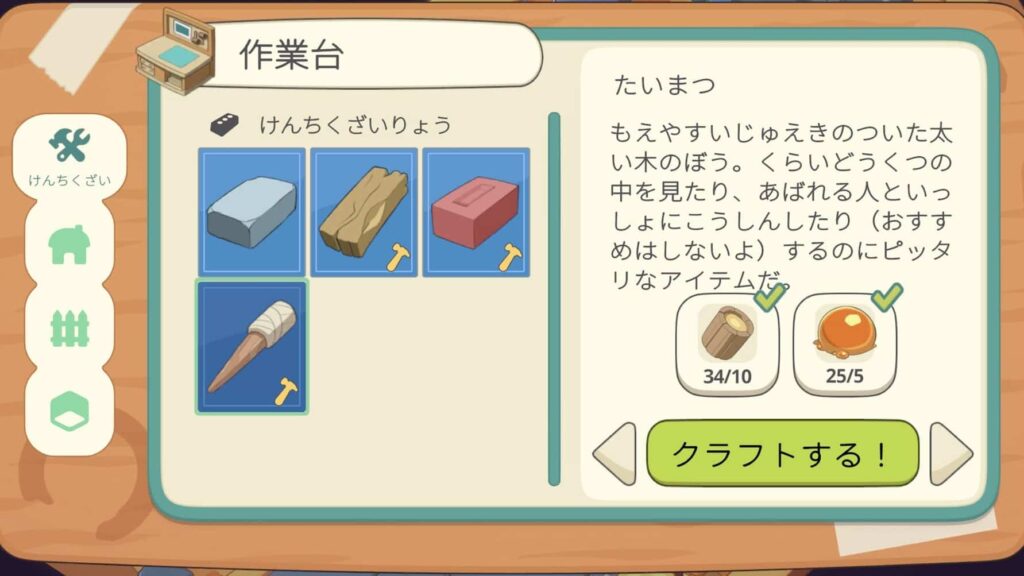 | せびれっちが まっくらなぱっちの洞窟の中で きょうりゅうサイフをなくしてしまった! もえあがるたいまつをつくってあげよう。 |